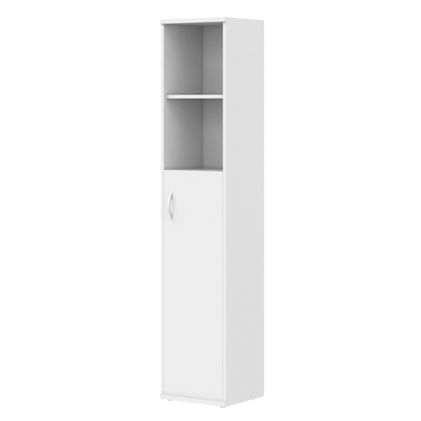 Компактный и высокий шкаф-стеллаж IMAGO для офисного или домашнего использования. Размеры - 406х1975х365 мм, тип – правосторонний, цвет – Белый. Оснащен 5 просторными полочками, 3 нижние закрываются дверцей из ЛДСП под цвет стеллажа, 2 верхние - открытые. На дверце установлена стильная металлическая ручка. Конструкция оснащена прочными силовыми креплениями – эксцентриковыми стяжками. Все торцы основных элементов стеллажа надежно защищены кромкой ПВХ – 2 мм. Регулируемые по высоте опоры обеспечат устойчивость на неровном полу.
