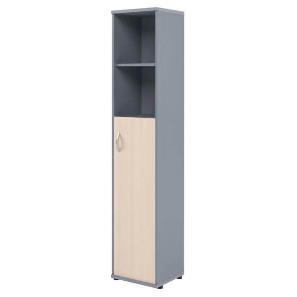 Компактный и высокий шкаф-стеллаж IMAGO для офисного или домашнего использования. Размеры - 406х1975х365 мм, тип – правосторонний, цвет – Клен/Металлик. Оснащен 5 просторными полочками, 3 нижние закрываются дверцей из ЛДСП другого цвета, 2 верхние - открытые. На дверце установлена стильная металлическая ручка. Конструкция оснащена прочными силовыми креплениями – эксцентриковыми стяжками. Все торцы основных элементов стеллажа надежно защищены кромкой ПВХ – 2 мм. Регулируемые по высоте опоры обеспечат устойчивость на неровном полу.