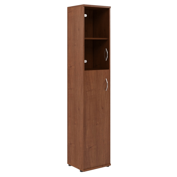 Универсальный шкаф комбинированый правый IMAGO для офисного или домашнего использования. Размеры - 406х1975х365 мм, цвет - Орех Французский. Оснащен 5 полками, три нижние полки закрыты дверцей из ЛДСП, две верхние - стекляной дверцей со стильной тонировкой в цвет бронзы. Шкаф оснащен регулируемыми опорами для компенсации неровностей пола.