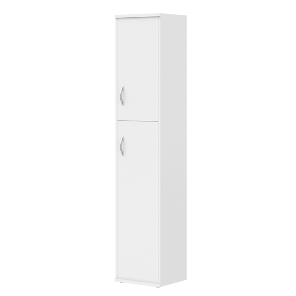Компактный и высокий шкаф IMAGO для офисного или домашнего использования. Размеры - 406х1975х365 мм, тип – правосторонний, цвет – Белый. Оснащен 5 просторными полочками, 3 нижние и 2 верхние отдельно закрываются дверцами из ЛДСП под цвет шкафа. На дверцах установлены стильные металлические ручки. Конструкция оснащена прочными силовыми креплениями – эксцентриковыми стяжками. Все торцы основных элементов шкафа надежно защищены кромкой ПВХ – 2 мм. Регулируемые по высоте опоры обеспечат устойчивость на неровном полу.