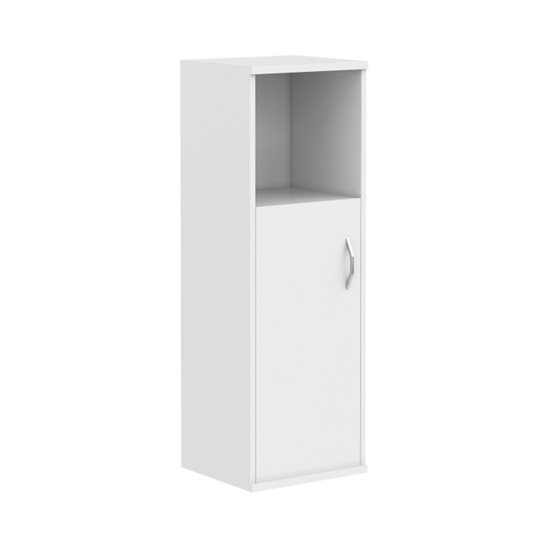 Компактный средний шкаф IMAGO для офисного или домашнего использования. Размеры - 406х1200х365 мм, тип – левосторонний, цвет – Белый. Оснащен 3 просторными полочками, 2 нижние закрываются дверцей из ЛДСП под цвет шкафа. На дверце установлена стильная металлическая ручка. Конструкция оснащена прочными силовыми креплениями – эксцентриковыми стяжками. Все торцы основных элементов шкафа надежно защищены кромкой ПВХ – 2 мм. Регулируемые по высоте опоры обеспечат устойчивость на неровном полу.