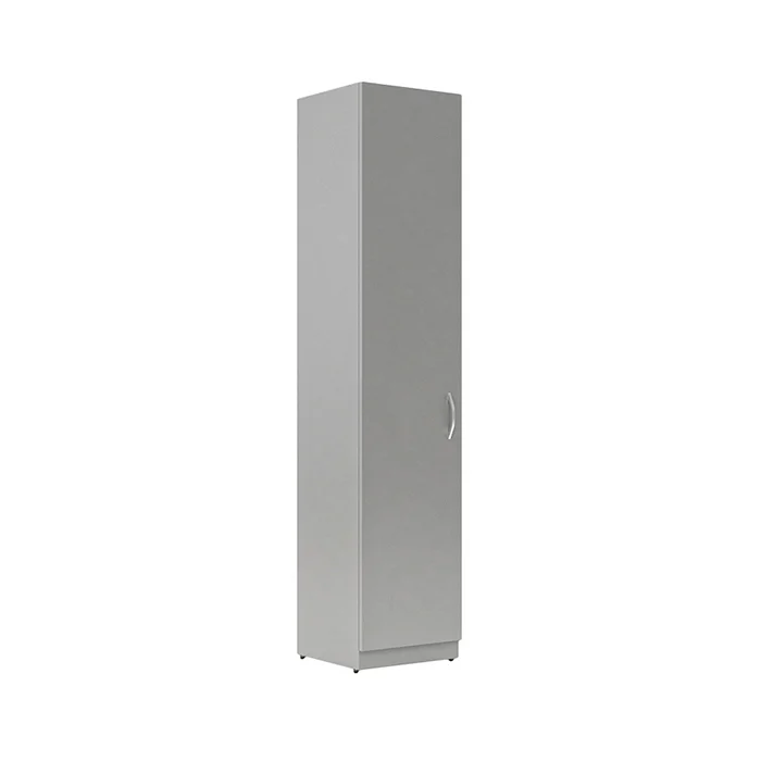 Узкий и высокий шкаф SIMPLE для офисного или домашнего использования. Размеры - 386х1815х375 мм, тип – левосторонний, цвет - Серый. Оснащен 5 полками, которые закрыты глухой дверцей из ЛДСП. Надежная защита торцевых поверхностей - кромка ПВХ. Шкаф оснащен регулируемыми опорами для компенсации неровностей пола.