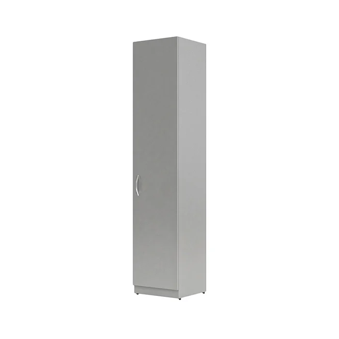 Узкий и высокий шкаф SIMPLE для офисного или домашнего использования. Размеры - 386х1815х375 мм, тип – правосторонний, цвет - Серый. Оснащен 5 полками, которые закрыты глухой дверцей из ЛДСП. Надежная защита торцевых поверхностей - кромка ПВХ. Шкаф оснащен регулируемыми опорами для компенсации неровностей пола.
