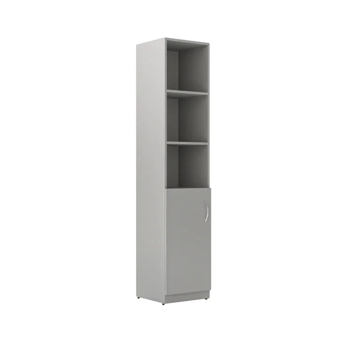 Шкаф-стеллаж SIMPLE для офисного или домашнего использования. Размеры - 386х1815х375 мм, тип – левосторонний, цвет - Серый. Шкаф оснащен 5 полками, две нижние закрываются глухой дверцей из ЛДСП, три верхние – открытые. Надежная защита торцевых поверхностей - кромка ПВХ. Стеллаж оснащен регулируемыми опорами для компенсации неровностей пола.