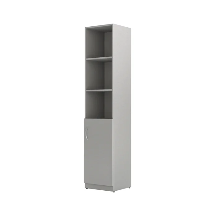 Шкаф-стеллаж SIMPLE для офисного или домашнего использования. Размеры - 386х1815х375 мм, тип – правосторонний, цвет - Серый. Шкаф оснащен 5 полками, две нижние закрываются глухой дверцей из ЛДСП, три верхние – открытые. Надежная защита торцевых поверхностей - кромка ПВХ. Стеллаж оснащен регулируемыми опорами для компенсации неровностей пола.