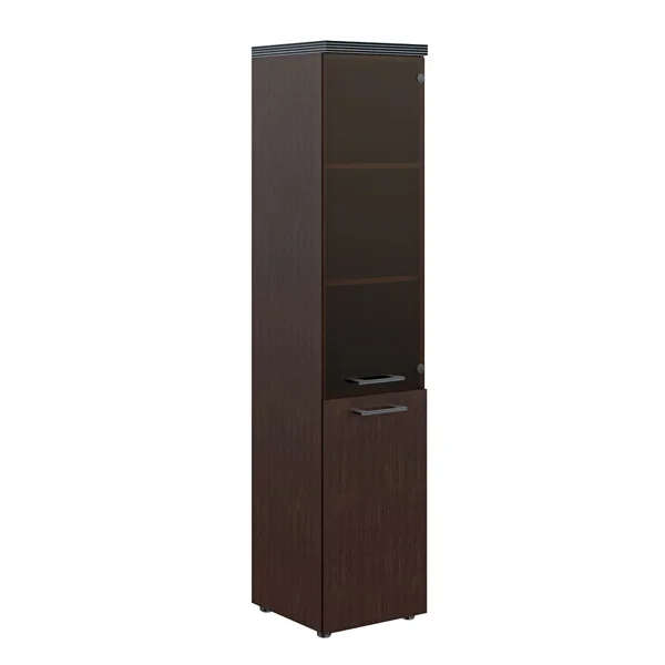 Универсальный и солидный комбинированный шкаф TORR для офисного или домашнего использования. Размеры - 432х1968х450 мм, тип - левосторонний, цвет - Венге Магия. Шкаф имеет солидный верхний топ 38 мм. Все торцевые поверхности основных элементов шкафа облицованы глянцевой акриловой пленкой 2 мм с декоративными полосками внутри кромки, что придает ей стильный 3D эффект. Торцы дополнительных элементов надежно защищены кромкой ПВХ 2 мм. Оснащен 5 полками, две нижние полки закрыты дверцей из ЛДСП, три верхние - стеклянной дверцей. На всех дверцах имеются долговечные и стильные металлические ручки. Конструкция шкафа оснащена прочными силовыми креплениями – эксцентриковыми стяжками. Регулируемые по высоте опоры обеспечат шкафу устойчивость на неровном полу.