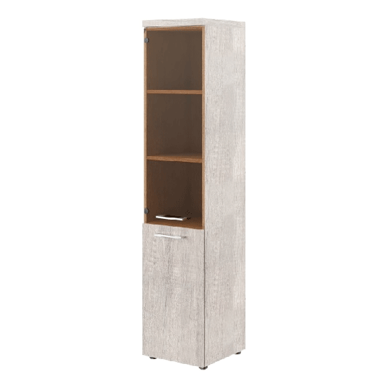 Универсальный и солидный комбинированный шкаф TORR-Z для офисного или домашнего использования. Размеры - 432х1968х450 мм, тип - левосторонний, цвет - Дуб Каньон Z. Данная модель выполнена в современном и эффектном дизайне, благодаря чему придаст кабинету более презентабельный вид. Шкаф имеет солидный верхний топ 38 мм. Все торцевые поверхности элементов шкафа надежно защищены кромкой ПВХ 2 мм. Оснащен 5 полками, две нижние полки закрыты дверцей из ЛДСП, три верхние - стеклянной дверцей. На всех дверцах имеются долговечные и стильные металлические ручки. Конструкция шкафа оснащена прочными силовыми креплениями – эксцентриковыми стяжками. Регулируемые по высоте опоры обеспечат шкафу устойчивость на неровном полу.