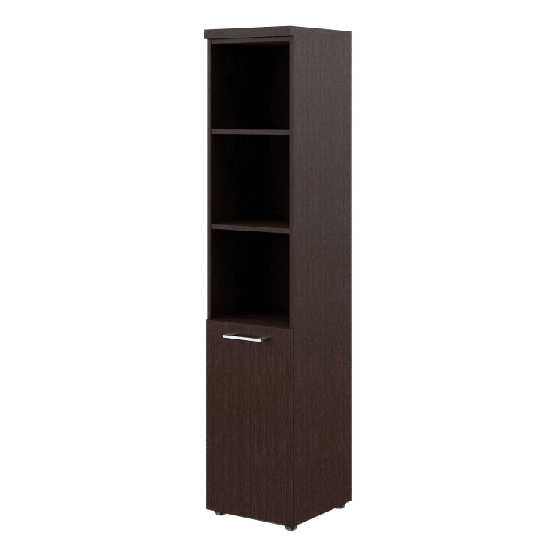 Универсальный шкаф-стеллаж TORR-Z для офисного или домашнего использования. Размеры - 432х1968х450 мм, тип - левосторонний, цвет – Венге Магия. Данная модель выполнена в современном и эффектном дизайне, благодаря чему придаст кабинету более презентабельный вид. Шкаф имеет солидный верхний топ 38 мм. Все торцевые поверхности элементов шкафа надежно защищены кромкой ПВХ 2 мм. Оснащен 5 полками, две нижние полки закрыты дверцей из ЛДСП, три верхние – открыты. На дверце установлена долговечная и стильная металлическая ручка. Конструкция шкафа оснащена прочными силовыми креплениями – эксцентриковыми стяжками. Регулируемые по высоте опоры обеспечат шкафу устойчивость на неровном полу.