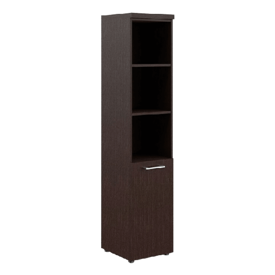 Универсальный шкаф-стеллаж TORR-Z для офисного или домашнего использования. Размеры - 432х1968х450 мм, тип - правосторонний, цвет – Венге Магия. Данная модель выполнена в современном и эффектном дизайне, благодаря чему придаст кабинету более презентабельный вид. Шкаф имеет солидный верхний топ 38 мм. Все торцевые поверхности элементов шкафа надежно защищены кромкой ПВХ 2 мм. Оснащен 5 полками, две нижние полки закрыты дверцей из ЛДСП, три верхние – открыты. На дверце установлена долговечная и стильная металлическая ручка. Конструкция шкафа оснащена прочными силовыми креплениями – эксцентриковыми стяжками. Регулируемые по высоте опоры обеспечат шкафу устойчивость на неровном полу.