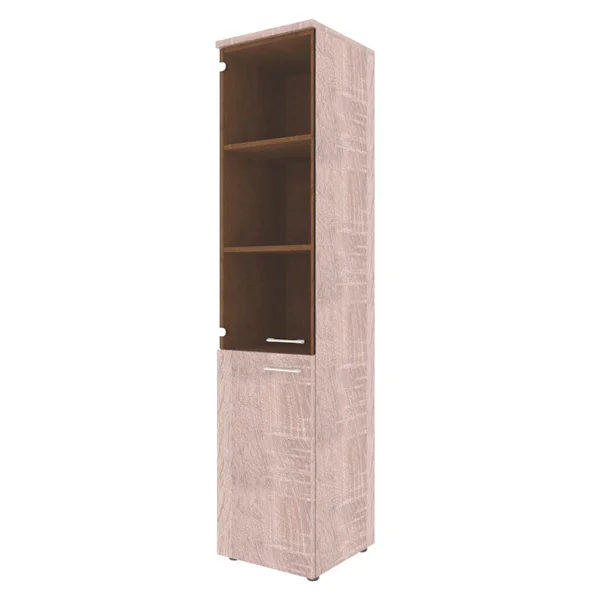 Универсальный шкаф комбинированный XTEN для офисного или домашнего использования. Размеры - 432х1955х432 мм, тип - левосторонний, цвет - Дуб Сонома. Шкаф имеет солидный топ – 25 мм. Оснащен 5 полками, две нижние полки закрыты дверцей из ЛДСП, три верхние - стекляной дверцей. На всех дверцах имеются долговечные и стильные металлические ручки. Конструкция шкафа оснащена прочными силовыми креплениями – эксцентриковыми стяжками. Регулируемые по высоте опоры обеспечат шкафу устойчивость на неровном полу.