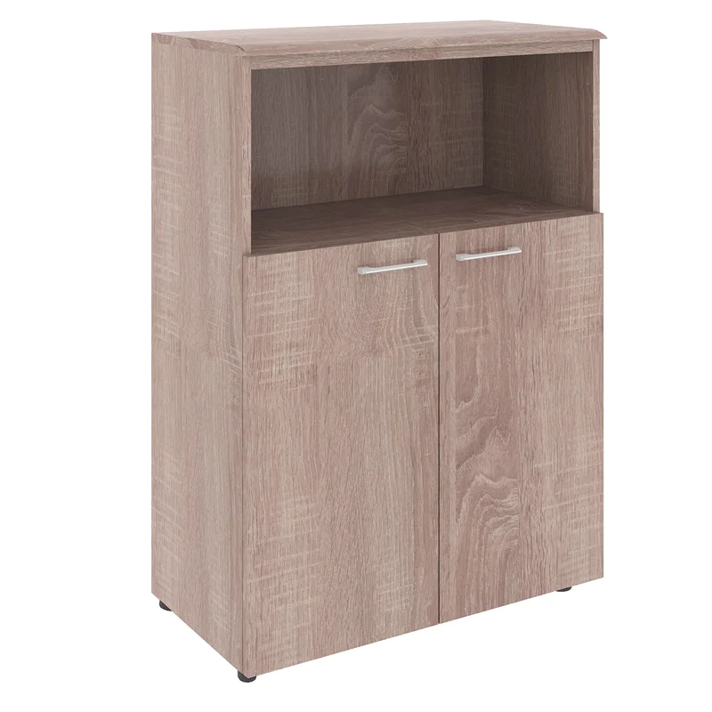Широкий средний шкаф WAVE для офисного или домашнего использования. Размеры - 856х1184х432 мм, цвет - Дуб Сонома. Шкаф имеет солидный топ из МДФ 19 мм Двустворчатый шкаф оснащенный 3 просторными полками, две нижние закрываются дверцами из ЛДСП, сверху - открытая ниша. На всех дверцах имеются долговечные и стильные металлические ручки. Конструкция шкафа оснащена прочными силовыми креплениями – эксцентриковыми стяжками. Регулируемые по высоте опоры обеспечат шкафу устойчивость на неровном полу.
