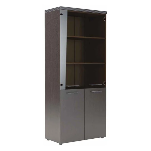 Широкий комбинированный шкаф ALTO для офисного или домашнего использования. Размеры - 850х1969х456 мм, цвет - Венге Магия. Двустворчатый шкаф оснащен 5 просторными полками, две нижние закрыты дверцами из ЛДСП под цвет конструкции, три верхние – стеклянными дверцами. На всех дверцах установлены стильные широкие металлические ручки. Конструкция шкафа оснащена прочными силовыми креплениями – эксцентриковыми стяжками. Все торцы основных элементов шкафа надежно защищены кромкой ПВХ – 2 мм. Регулируемые по высоте опоры обеспечат шкафу устойчивость на неровном полу.