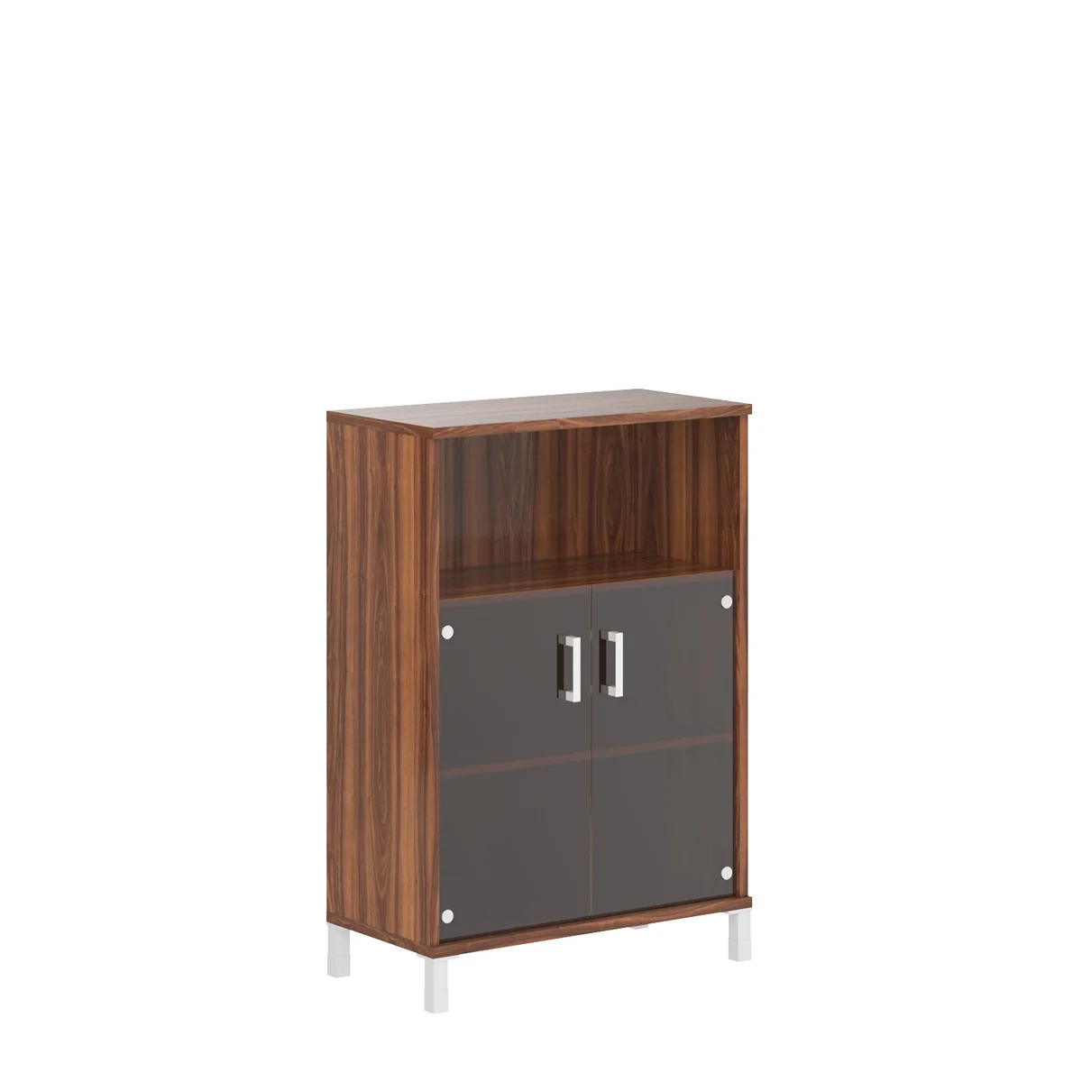 Универсальный средний шкаф BORN для офисного или домашнего использования. Размеры - 900х1286х450 мм, цвет – Орех Даллас. Оснащен 3 просторными полочками, 2 нижние закрываются стеклянными дверцами, а верхняя - открытая. На дверцах установлены стильные металлические ручки. Шкаф имеет опоры увеличенной длины. Конструкция оснащена прочными силовыми креплениями – эксцентриковыми стяжками. Все торцы основных элементов шкафа надежно защищены кромкой ПВХ – 2 мм. Регулируемые по высоте опоры обеспечат шкафу устойчивость на неровном полу.