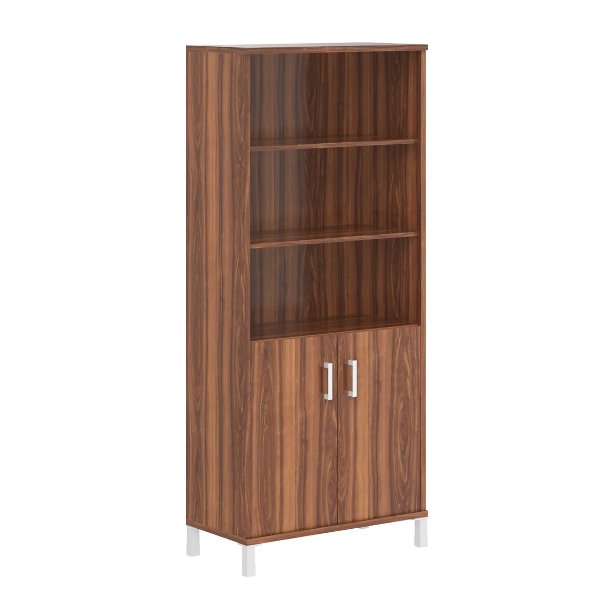 Широкий шкаф-стеллаж BORN для офисного или домашнего использования. Размеры - 900х2054х450 мм, цвет – Орех Даллас. Шкаф имеет опоры увеличенной длины. Двустворчатый шкаф оснащен 5 просторными полками, две нижние закрыты дверцами из ЛДСП под цвет конструкции, три верхние – открытые. На дверцах установлены стильные металлические ручки. Конструкция шкафа оснащена прочными силовыми креплениями – эксцентриковыми стяжками. Все торцы основных элементов шкафа надежно защищены кромкой ПВХ – 2 мм. Регулируемые по высоте опоры обеспечат шкафу устойчивость на неровном полу.
