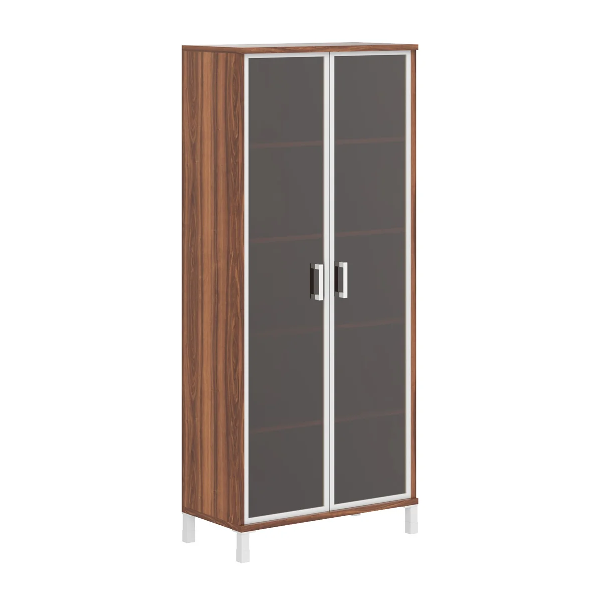 Широкий и высокий шкаф BORN для офисного или домашнего использования. Размеры - 900х2054х450 мм, цвет - Орех Даллас. Шкаф имеет опоры увеличенной длины. Двустворчатый шкаф оснащенный 5 просторными полками, которые закрыты стеклянными дверцами с металлической рамкой по краям. На дверцах установлены стильные металлические ручки. Конструкция шкафа оснащена прочными силовыми креплениями – эксцентриковыми стяжками. Все торцы основных элементов шкафа надежно защищены кромкой ПВХ – 2 мм. Регулируемые по высоте опоры обеспечат шкафу устойчивость на неровном полу.