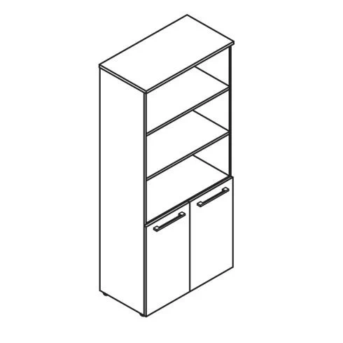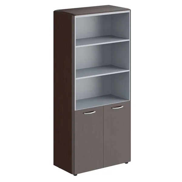 Широкий шкаф-стеллаж DIONI для офисного или домашнего использования. Размеры - 892х1950х470 мм, основной цвет - Венге Магия, дополнительный цвет - Серый. Верх шкафа имеет солидный топ с плавными фрезерованными краями. Двустворчатый шкаф оснащен 5 просторными полками, две нижние закрыты дверцами из ЛДСП под цвет конструкции, три верхние – открытые. На дверцах установлены стильные металлические ручки. Конструкция шкафа оснащена прочными силовыми креплениями – эксцентриковыми стяжками. Надежная защита всех элементов из ЛДСП – кромка ПВХ. Регулируемые по высоте опоры обеспечат шкафу устойчивость на неровном полу.