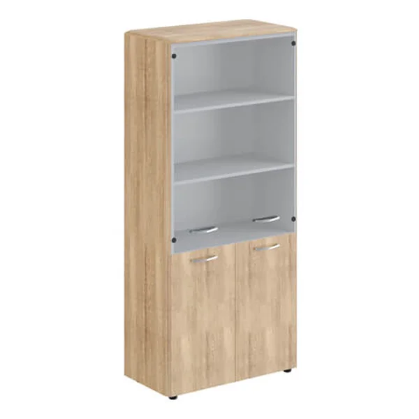 Широкий комбинированный шкаф DIONI для офисного или домашнего использования. Размеры - 892х1950х470 мм, основной цвет - Дуб Каньон, дополнительный цвет - Серый. Верх шкафа имеет солидный топ с плавными фрезерованными краями. Двустворчатый шкаф оснащен 5 просторными полками, две нижние закрыты дверцами из ЛДСП под цвет конструкции, три верхние – стеклянными дверцами. На всех дверцах установлены стильные металлические ручки. Конструкция шкафа оснащена прочными силовыми креплениями – эксцентриковыми стяжками. Надежная защита всех элементов из ЛДСП – кромка ПВХ. Регулируемые по высоте опоры обеспечат шкафу устойчивость на неровном полу.