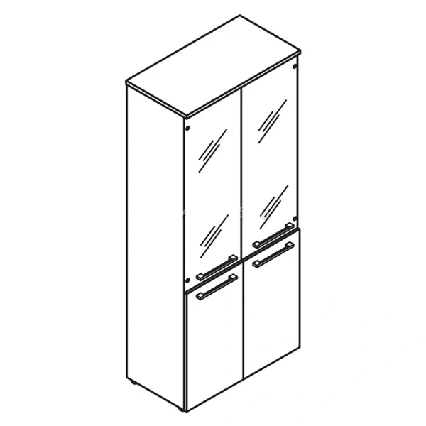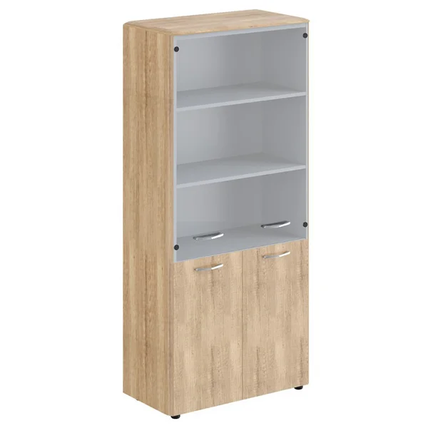 Широкий комбинированный шкаф с замком DIONI для офисного или домашнего использования. Размеры - 892х1950х470 мм, основной цвет - Дуб Каньон, дополнительный цвет - Серый. Верх шкафа имеет солидный топ с плавными фрезерованными краями. Двустворчатый шкаф оснащен 5 просторными полками, две нижние закрыты дверцами из ЛДСП под цвет конструкции, три верхние – стеклянными дверцами. На дверцах установлены стильные металлические ручки и замок для безопасности. Конструкция шкафа оснащена прочными силовыми креплениями – эксцентриковыми стяжками. Надежная защита всех элементов из ЛДСП – кромка ПВХ. Регулируемые по высоте опоры обеспечат шкафу устойчивость на неровном полу.
