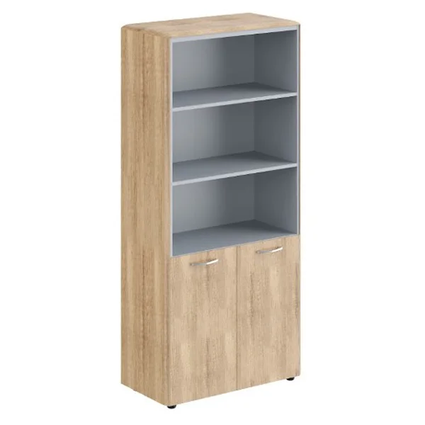 Широкий шкаф-стеллаж DIONI для офисного или домашнего использования. Размеры - 892х1950х470 мм, основной цвет - Дуб Каньон, дополнительный цвет - Серый. Верх шкафа имеет солидный топ с плавными фрезерованными краями. Двустворчатый шкаф оснащен 5 просторными полками, две нижние закрыты дверцами из ЛДСП под цвет конструкции, три верхние – открытые. На дверцах установлены стильные металлические ручки. Конструкция шкафа оснащена прочными силовыми креплениями – эксцентриковыми стяжками. Надежная защита всех элементов из ЛДСП – кромка ПВХ. Регулируемые по высоте опоры обеспечат шкафу устойчивость на неровном полу.