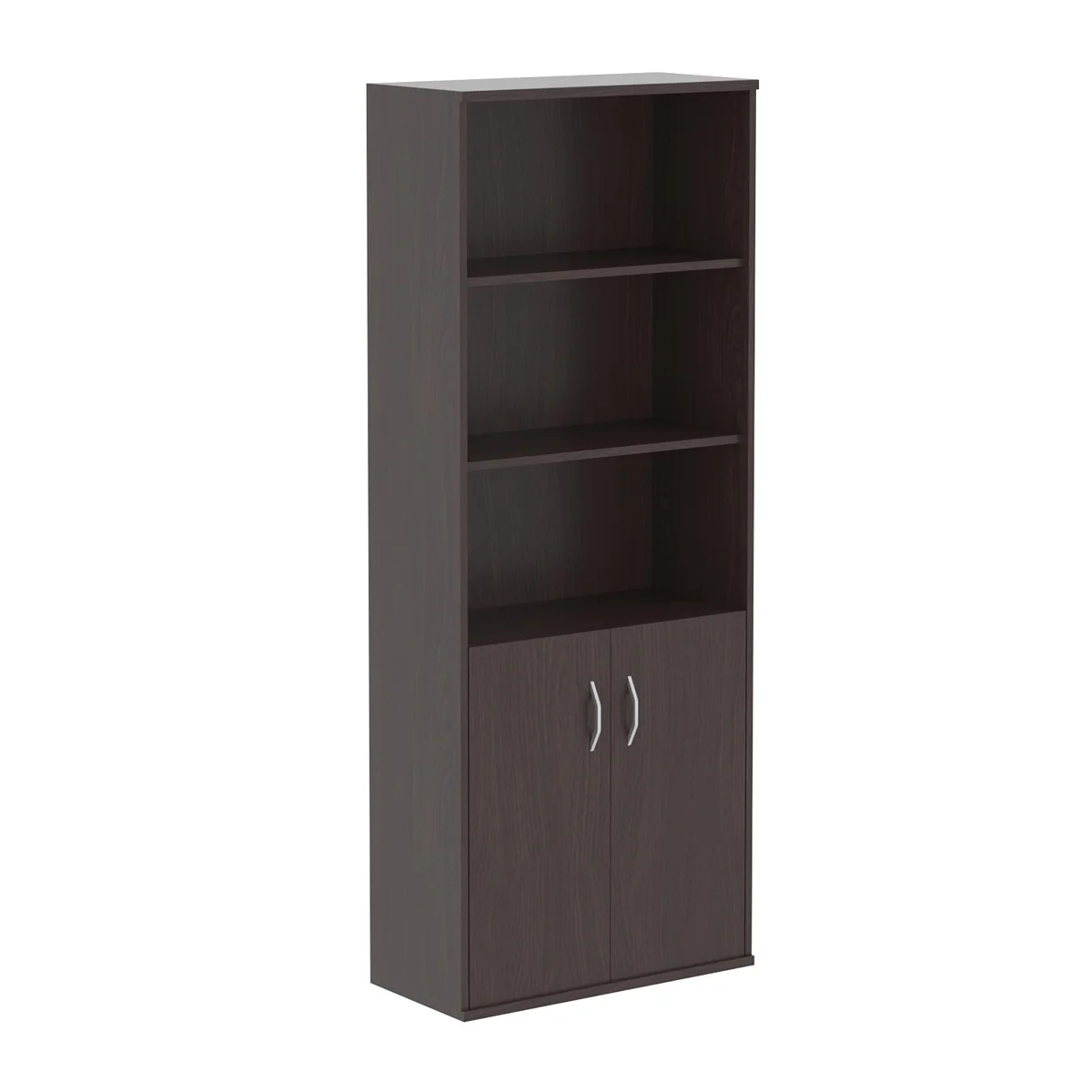 Шкаф-стеллаж IMAGO для офисного или домашнего использования. Размеры - 770х1975х365 мм, цвет - Венге Магия. Двустворчатый шкаф, оснащенный 5 просторными полками, две нижние закрывают дверцы из ЛДСП, три верхние - открытые. Шкаф оснащен регулируемыми опорами для компенсации неровностей пола.