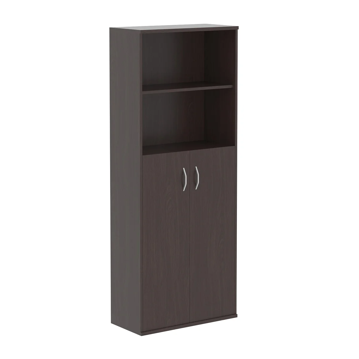 Универсальный шкаф-стеллаж IMAGO для офисного или домашнего использования. Размеры -770х1975х365 мм, цвет – Венге Магия. Оснащен 5 просторными полочками, 3 нижние закрываются дверцами из ЛДСП под цвет стеллажа, 2 верхние - открытые. На дверцах установлены стильные металлические ручки. Конструкция оснащена прочными силовыми креплениями – эксцентриковыми стяжками. Все торцы основных элементов стеллажа надежно защищены кромкой ПВХ – 2 мм. Регулируемые по высоте опоры обеспечат устойчивость на неровном полу.