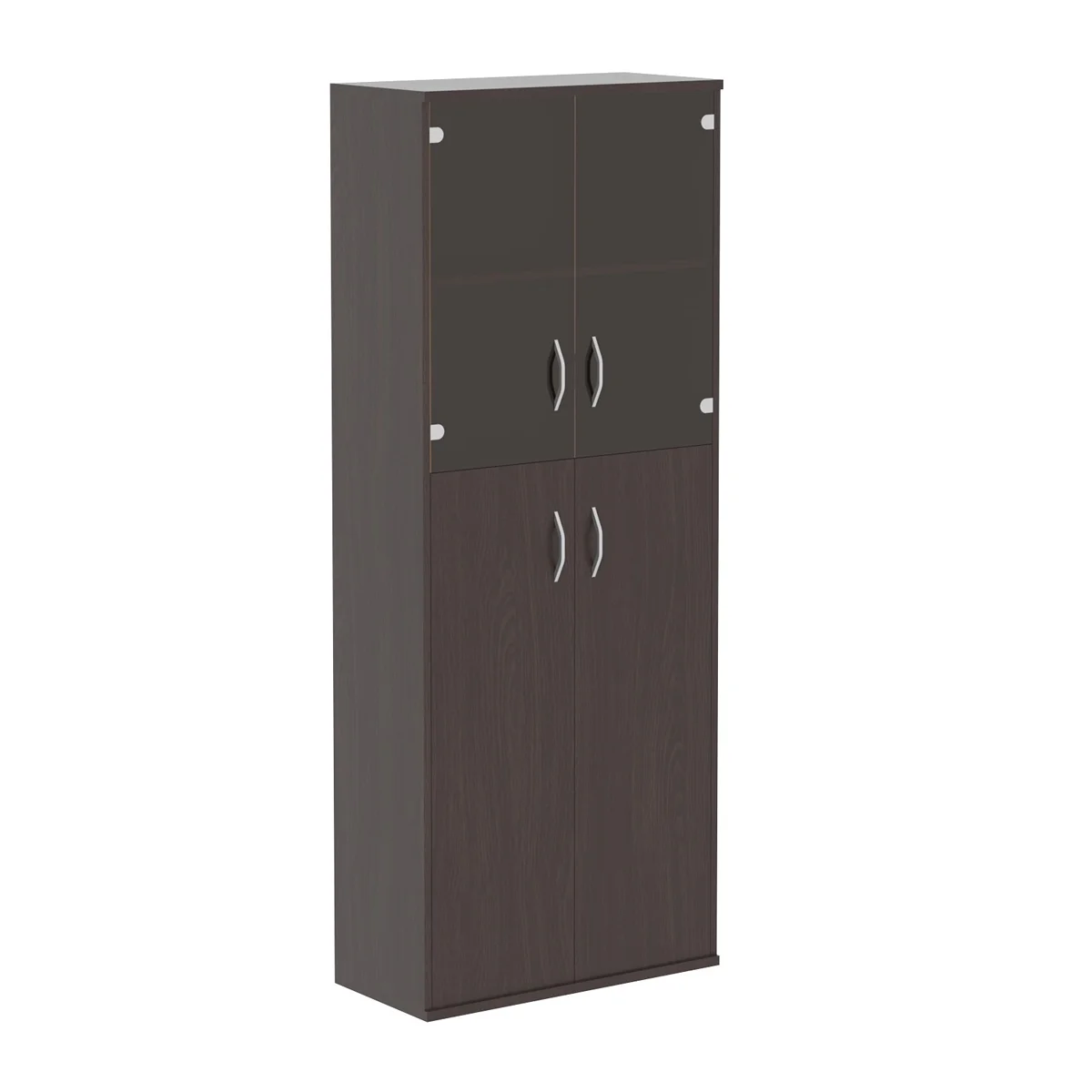 Широкий и высокий комбинированный шкаф IMAGO для офисного или домашнего использования. Размеры - 770х1975х365 мм, цвет - Венге Магия. Двустворчатый шкаф, оснащенный 5 просторными полками, три нижние полки закрыты дверцей из ЛДСП, две верхние - стекляной дверцей со стильной тонировкой в цвет бронзы. Шкаф оснащен регулируемыми опорами для компенсации неровностей пола.