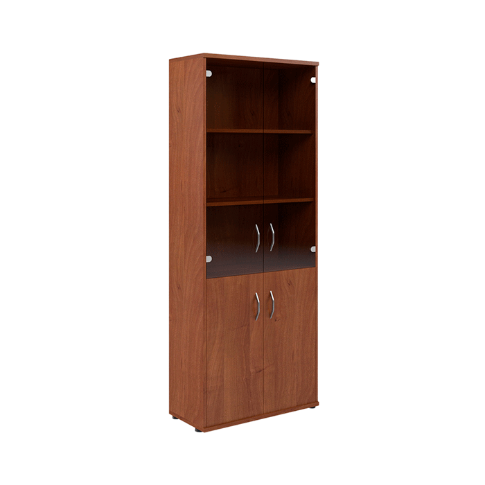 Широкий и высокий комбинированный шкаф IMAGO для офисного или домашнего использования. Размеры - 770х1975х365 мм, цвет - Орех Французский. Двустворчатый шкаф, оснащенный 5 просторными полками, две нижние полки закрыты дверцей из ЛДСП, три верхние - стекляной дверцей со стильной тонировкой в цвет бронзы. Шкаф оснащен регулируемыми опорами для компенсации неровностей пола.