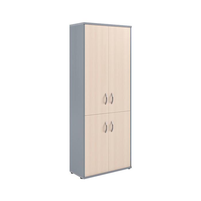 Широкий и высокий шкаф IMAGO для офисного или домашнего использования. Размеры - 770х1975х365 мм, цвет - Клен/Металлик. Цвет каркаса - Металлик. Двустворчатый шкаф, для удобства дверцы из ЛДСП цвета Клен разделены на две секции, которые отдельно закрывают три верхние и две нижние полки. Шкаф оснащен регулируемыми опорами для компенсации неровностей пола.