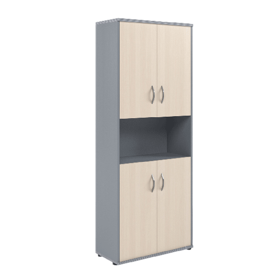 Универсальный комбинированный шкаф IMAGO для офисного или домашнего использования. Размеры -770х1975х365 мм, цвет – Клен/Металлик. Оснащен 5 просторными полочками, 2 нижние и 2 верхние отдельно закрываются дверцами из ЛДСП другого цвета, а посередине одна открытая ниша. На всех дверцах установлены стильные металлические ручки. Конструкция оснащена прочными силовыми креплениями – эксцентриковыми стяжками. Все торцы основных элементов шкафа надежно защищены кромкой ПВХ – 2 мм. Регулируемые по высоте опоры обеспечат устойчивость на неровном полу.