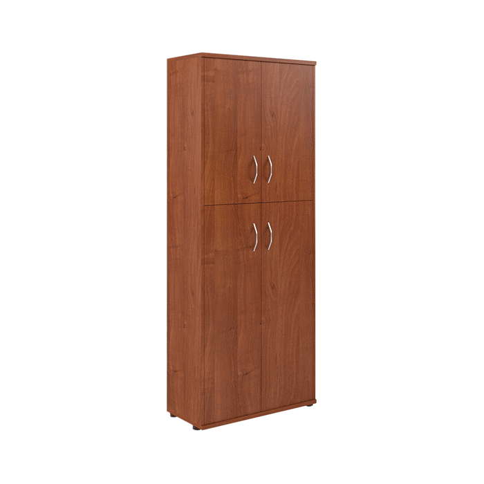 Универсальный высокий шкаф IMAGO для офисного или домашнего использования. Размеры -770х1975х365 мм, цвет – Орех Французский. Оснащен 5 просторными полочками, 3 нижние и 2 верхние отдельно закрываются дверцами из ЛДСП под цвет шкафа. На всех дверцах установлены стильные металлические ручки. Конструкция оснащена прочными силовыми креплениями – эксцентриковыми стяжками. Все торцы основных элементов шкафа надежно защищены кромкой ПВХ – 2 мм. Регулируемые по высоте опоры обеспечат устойчивость на неровном полу.