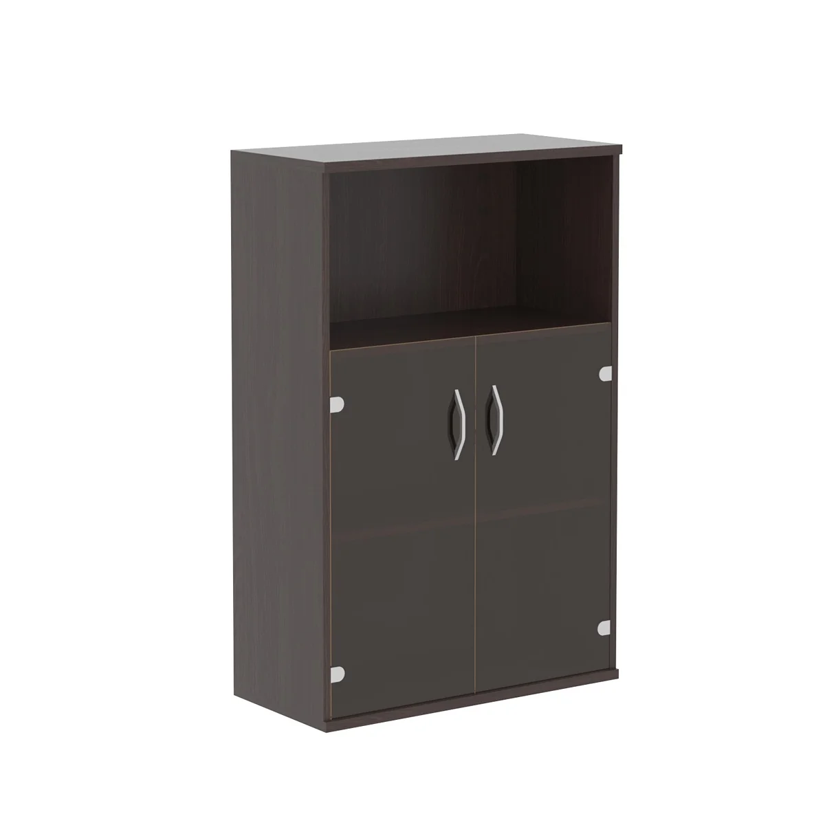 Универсальный средний шкаф IMAGO для офисного или домашнего использования. Размеры -770х1200х365 мм, цвет – Венге Магия. Оснащен 3 просторными полочками, 2 нижние закрываются стеклянными дверцами. На дверцах установлены стильные металлические ручки. Конструкция оснащена прочными силовыми креплениями – эксцентриковыми стяжками. Все торцы основных элементов шкафа надежно защищены кромкой ПВХ – 2 мм. Регулируемые по высоте опоры обеспечат устойчивость на неровном полу.
