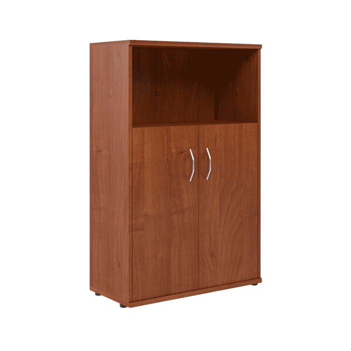 Универсальный средний шкаф IMAGO для офисного или домашнего использования. Размеры -770х1200х365 мм, цвет – Орех Французский. Оснащен 3 просторными полочками, 2 нижние закрываются дверцами из ЛДСП под цвет шкафа. На дверцах установлены стильные металлические ручки. Конструкция оснащена прочными силовыми креплениями – эксцентриковыми стяжками. Все торцы основных элементов шкафа надежно защищены кромкой ПВХ – 2 мм. Регулируемые по высоте опоры обеспечат устойчивость на неровном полу.