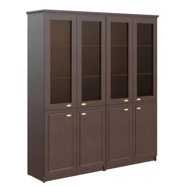 Большой комбинированный шкаф RAUT для офисного или домашнего использования, размер - 1808х2023х466 мм, цвет – Венге Магия. Двойной двустворчатый шкаф оснащенный 5 полками, 2 нижние закрываются дверцами из ЛДСП под цвет конструкции, три верхние – стеклянными дверцами. На всех дверцах установлены стильные металлические ручки. Верх оснащен солидным топом из ЛДСП 18 мм с рамочным профилем из МДФ 30 мм. Фасады обрамлены декоративными накладками из МДФ. Надежная защита всех элементов из ЛДСП – кромка ПВХ. Конструкция шкафа оснащена прочными силовыми креплениями – эксцентриковыми стяжками. Регулируемые по высоте опоры обеспечат устойчивость на неровном полу.