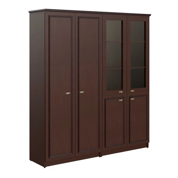 Большой комбинированный шкаф с гардеробом RAUT для офисного или домашнего использования, размер - 1808х2023х466 мм, цвет – Венге Магия. Двустворчатый шкаф оснащенный 5 полками, 2 нижние закрываются дверцами из ЛДСП под цвет конструкции, три верхние – стеклянными дверцами. Гардероб оснащен 2 выдвижными штангами и 2 полочками, которые расположены сверху и снизу. На всех дверцах установлены стильные металлические ручки. Верх оснащен солидным топом из ЛДСП 18 мм с рамочным профилем из МДФ 30 мм. Фасады обрамлены декоративными накладками из МДФ. Надежная защита всех элементов из ЛДСП – кромка ПВХ. Конструкция шкафа оснащена прочными силовыми креплениями – эксцентриковыми стяжками. Регулируемые по высоте опоры обеспечат устойчивость на неровном полу.