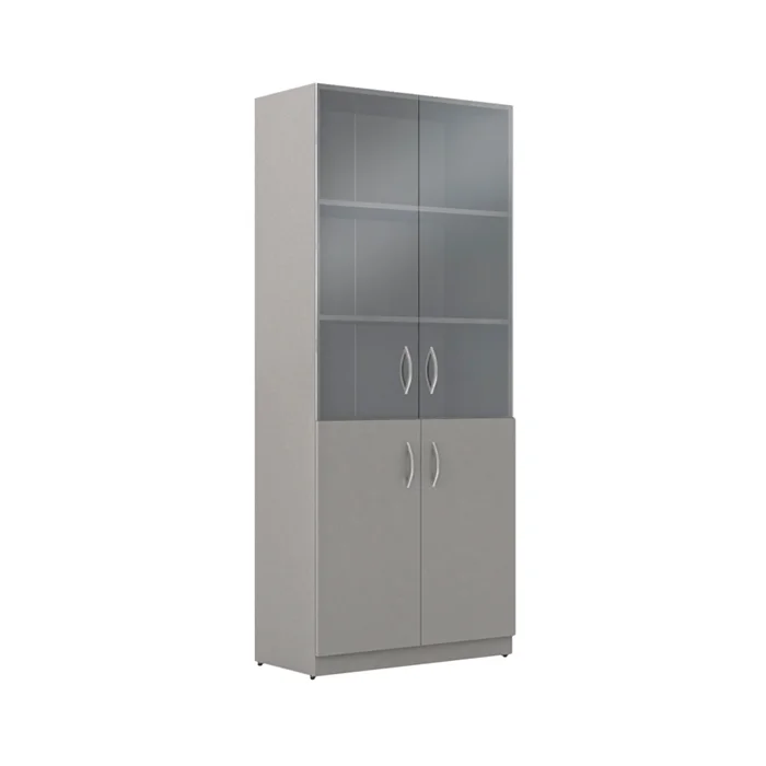 Широкий комбинированный шкаф SIMPLE для офисного или домашнего использования. Размеры - 770х1815х375 мм, цвет - Серый. Оснащен 5 полками, две нижние полки закрыты глухими дверцами из ЛДСП, три верхние - легкими стеклянными дверцами. Надежная защита торцевых поверхностей - кромка ПВХ. Шкаф оснащен регулируемыми опорами для компенсации неровностей пола.