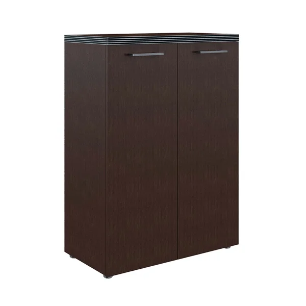 Стильный и широкий шкаф средний TORR для офисного или домашнего использования. Размеры - 856х1203х450 мм, цвет - Венге Магия. Шкаф имеет солидный и надежный верхний топ 38 мм. Все торцевые поверхности основных элементов шкафа облицованы глянцевой акриловой пленкой 2 мм с декоративными полосками внутри кромки, что придает ей стильный 3D эффект. Торцы дополнительных элементов надежно защищены кромкой ПВХ 2 мм. Двустворчатый шкаф оснащен 3 полками, которые закрыты дверцами из ЛДСП. На дверцах установлены долговечные и стильные металлические ручки. Конструкция шкафа оснащена прочными силовыми креплениями – эксцентриковыми стяжками. Регулируемые по высоте опоры обеспечат шкафу устойчивость на неровном полу.