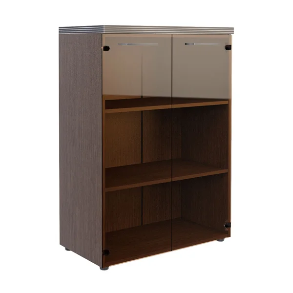 Стильный и широкий шкаф средний TORR для офисного или домашнего использования. Размеры - 856х1203х450 мм, цвет - Венге Магия. Шкаф имеет солидный верхний топ 38 мм. Все торцевые поверхности основных элементов шкафа облицованы глянцевой акриловой пленкой 2 мм с декоративными полосками внутри кромки, что придает ей стильный 3D эффект. Торцы дополнительных элементов надежно защищены кромкой ПВХ 2 мм. Двустворчатый шкаф оснащен 3 полками, которые закрыты стеклянными дверцами. На дверцах установлены долговечные и стильные металлические ручки. Конструкция шкафа оснащена прочными силовыми креплениями – эксцентриковыми стяжками. Регулируемые по высоте опоры обеспечат шкафу устойчивость на неровном полу.
