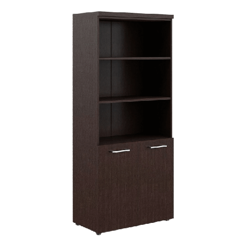 Солидный и широкий шкаф-стеллаж TORR-Z для офисного или домашнего использования. Размеры - 856х1968х450 мм, цвет – Венге Магия. Данная модель выполнена в современном и эффектном дизайне, благодаря чему придаст кабинету более презентабельный вид. Шкаф имеет солидный верхний топ 38 мм. Все торцевые поверхности элементов шкафа надежно защищены кромкой ПВХ 2 мм. Оснащен 5 полками, две нижние полки закрыты дверцами из ЛДСП, три верхние – открыты. На дверцах установлены долговечные и стильные металлические ручки. Конструкция шкафа оснащена прочными силовыми креплениями – эксцентриковыми стяжками. Регулируемые по высоте опоры обеспечат шкафу устойчивость на неровном полу.