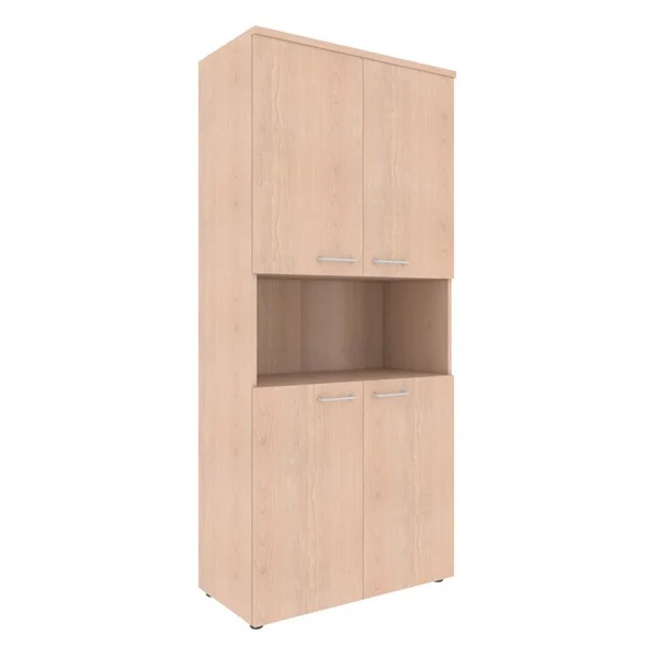Широкий и высокий шкаф XTEN для офисного или домашнего использования. Размеры - 856х1955х432 мм, цвет - Бук Тиара. Оснащен 5 полками, 2 нижние и 2 верхние отдельно закрываются дверцами из ЛДСП, посередине – открытая ниша. На дверцах установлены долговечные и стильные металлические ручки. Конструкция шкафа оснащена прочными силовыми креплениями – эксцентриковыми стяжками. Надежная защита торцов всех элементов - кромка ПВХ. Регулируемые по высоте опоры обеспечат шкафу устойчивость на неровном полу.
