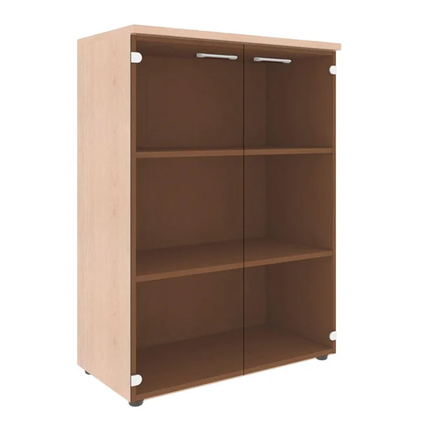 Широкий шкаф средний XTEN для офисного или домашнего использования. Размеры - 856х1190х432 мм, цвет - Бук Тиара. Шкаф имеет солидный топ – 25 мм. Двустворчатый шкаф оснащенный 3 просторными полками, которые закрыты стеклянными дверцами. На дверцах установлены долговечные и стильные металлические ручки. Конструкция шкафа оснащена прочными силовыми креплениями – эксцентриковыми стяжками. Регулируемые по высоте опоры обеспечат шкафу устойчивость на неровном полу.
