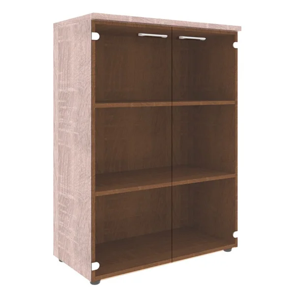 Широкий шкаф средний XTEN для офисного или домашнего использования. Размеры - 856х1190х432 мм, цвет - Дуб Сонома. Шкаф имеет солидный топ – 25 мм. Двустворчатый шкаф оснащенный 3 просторными полками, которые закрыты стеклянными дверцами. На дверцах установлены долговечные и стильные металлические ручки. Конструкция шкафа оснащена прочными силовыми креплениями – эксцентриковыми стяжками. Регулируемые по высоте опоры обеспечат шкафу устойчивость на неровном полу.