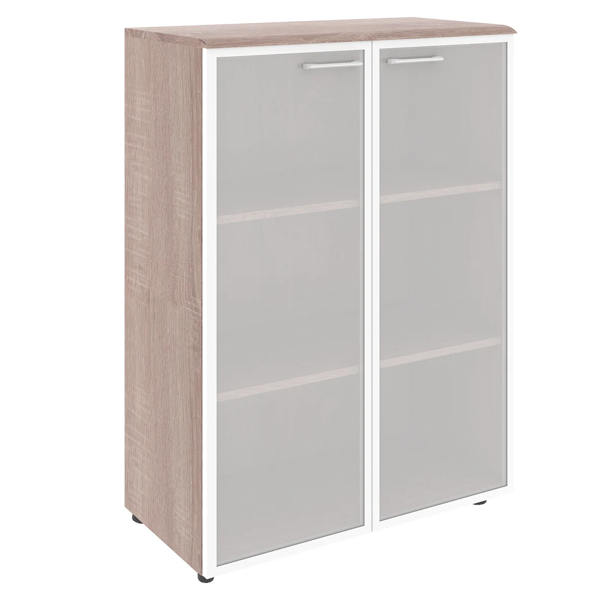 Широкий шкаф средний WAVE для офисного или домашнего использования. Размеры - 856х1184х432 мм, цвет - Дуб Сонома. Шкаф имеет солидный топ из МДФ – 19 мм. Двустворчатый шкаф оснащенный 3 просторными полками, которые закрыты стеклянными дверцами со стильной матовой тонировкой в металлической рамке. На дверцах установлены долговечные и стильные металлические ручки. Конструкция шкафа оснащена прочными силовыми креплениями – эксцентриковыми стяжками. Регулируемые по высоте опоры обеспечат шкафу устойчивость на неровном полу.