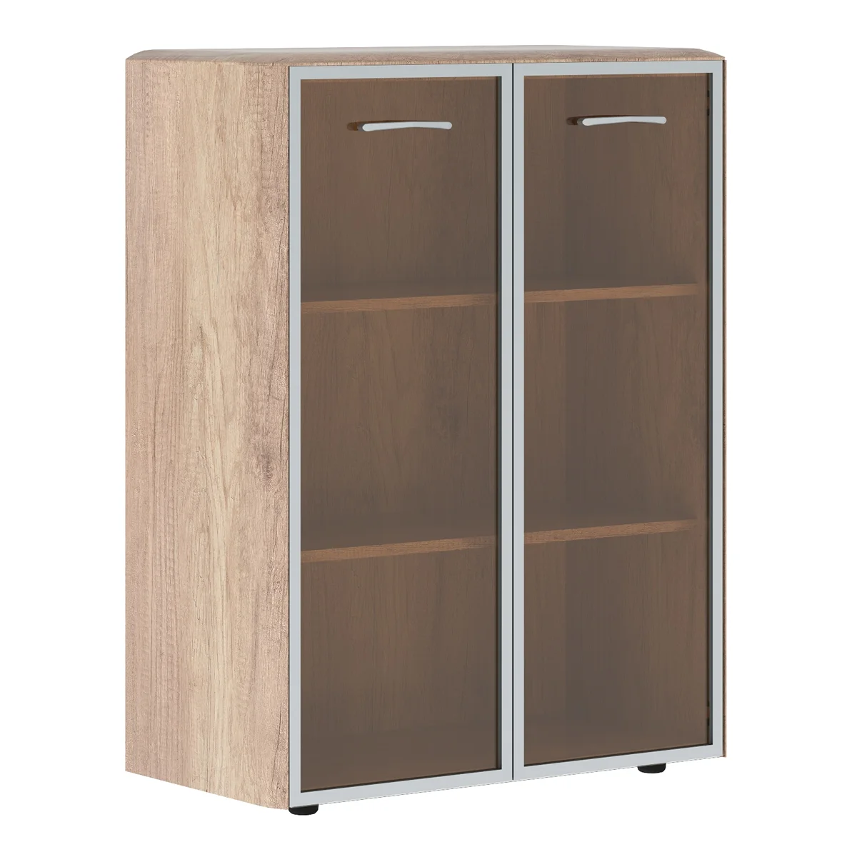 Широкий средний шкаф DIONI для офисного или домашнего использования. Размеры - 892х1185х470 мм, основной цвет - Дуб Каньон, дополнительный цвет - Серый. Верх шкафа имеет солидный топ с плавными фрезерованными краями. Двустворчатый шкаф оснащен 3 просторными полками, которые закрываются стеклянными дверцами в алюминевой раме. На дверцах установлены стильные металлические ручки. Конструкция шкафа оснащена прочными силовыми креплениями – эксцентриковыми стяжками. Надежная защита всех элементов из ЛДСП – кромка ПВХ. Регулируемые по высоте опоры обеспечат шкафу устойчивость на неровном полу.