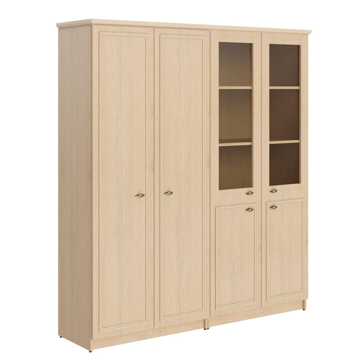 Большой комбинированный шкаф с гардеробом RAUT для офисного или домашнего использования, размер - 1808х2023х466 мм, цвет – Дуб Девон. Двустворчатый шкаф оснащенный 5 полками, 2 нижние закрываются дверцами из ЛДСП под цвет конструкции, три верхние – стеклянными дверцами. Гардероб оснащен 2 выдвижными штангами и 2 полочками, которые расположены сверху и снизу. На всех дверцах установлены стильные металлические ручки. Верх оснащен солидным топом из ЛДСП 18 мм с рамочным профилем из МДФ 30 мм. Фасады обрамлены декоративными накладками из МДФ. Надежная защита всех элементов из ЛДСП – кромка ПВХ. Конструкция шкафа оснащена прочными силовыми креплениями – эксцентриковыми стяжками. Регулируемые по высоте опоры обеспечат устойчивость на неровном полу.