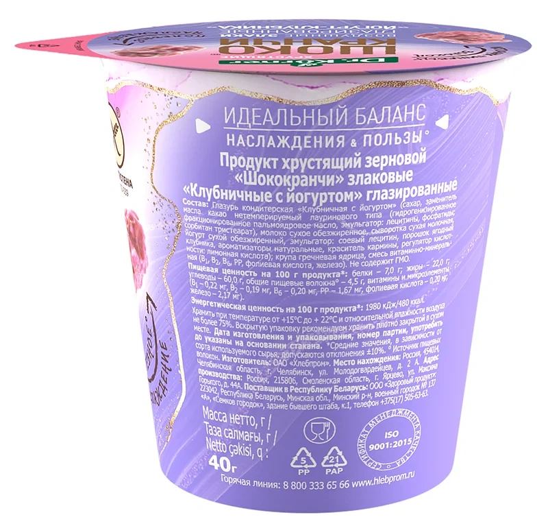 Идеальный баланс вкуса и пользы, который создается из воздушных злаков и нанесенного по технологии 360?. Шококранчи Клубничные с йогуртом - это по истине полезное наслаждение, которое является источником пищевых волокон и не содержит глютен.