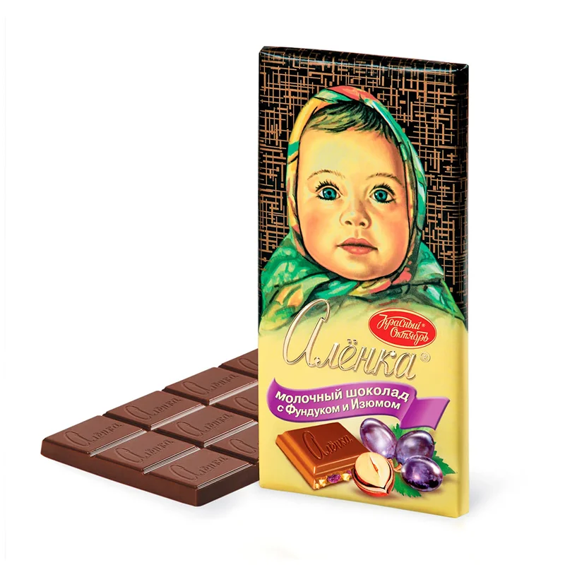 Молочный шоколад Аленка с фундуком и изюмом. Изысканное богатое сочетание дробленых ядер лесного ореха и вязкой виноградной сладости изюма с нежным вкусом классического молочного шоколада Аленка, созданного по оригинальной рецептуре 60-х годов. Прекрасное дополнение к чаю, кофе, утонченное лакомство для легкого перекуса, когда хочется сладкого. Противопоказано при индивидуальной непереносимости белка молока.