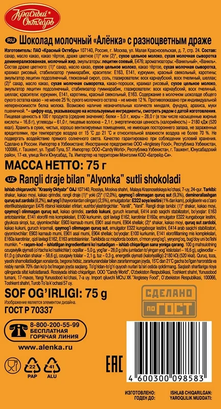 Шоколад Аленка молочный с разноцветным драже, 75г