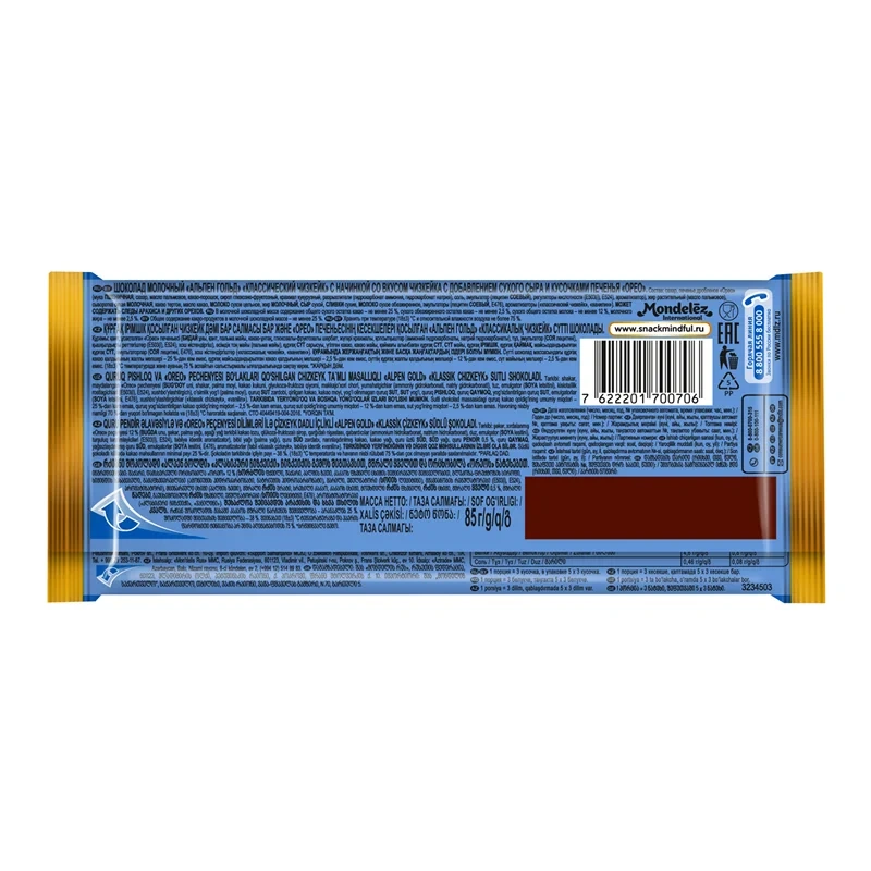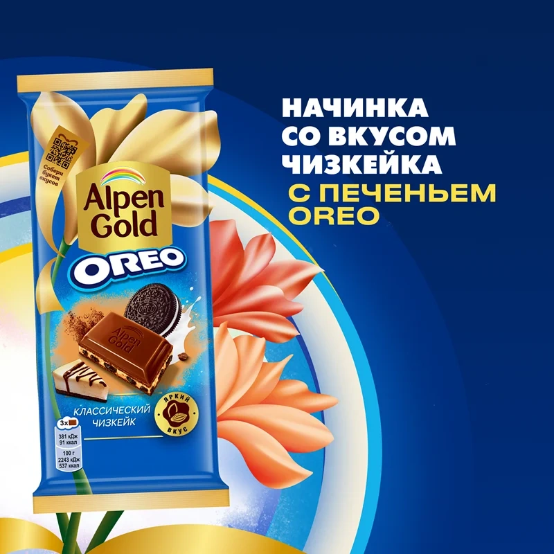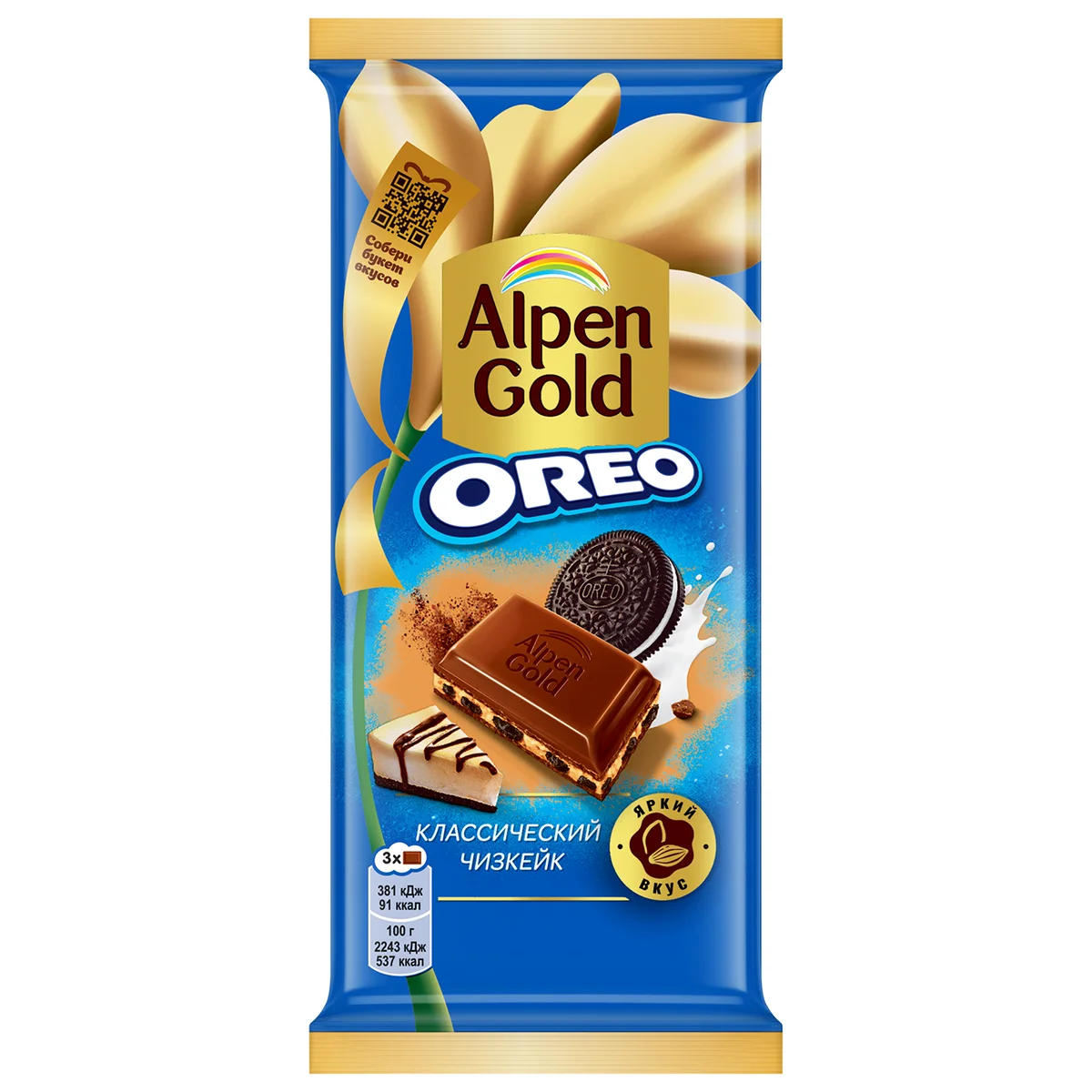 Alpen Gold Oreo Шоколад молочный Классический Чизкейк с начинкой со вкусом чизкейка с добавлением сухого сыра и кусочками печенья Орео, 85 г Запусти игру вкусов вместе с Alpen Gold! Alpen Gold уже более 25 лет радует ценителей шоколада необычными вкусовыми сочетаниями. Alpen Gold Oreo — это яркий микс молочного шоколада, любимого во всем мире печенья OREO с какао и разнообразных ингредиентов, которые делают этот союз еще вкуснее. Alpen Gold Oreo — выигрышная комбинация, сложно не влюбиться! Шоколад Alpen Gold Oreo с начинкой со вкусом чизкейка и кусочками печенья открывает новые грани сладости благодаря вкусовым ноткам любимого многими сырного десерта. Шоколад с печеньем Alpen Gold Oreo изготовлен по высоким стандартам качества из какао-продуктов. Каждая шоколадка заряжает игривым настроением и приглашает к вкусным открытиям. Плитка шоколада Alpen Gold Oreo — это вкусный десерт для тех, кто ищет сладкое к чаю. Насладиться удовольствием от ее вкуса можно самому, или разделить приятные эмоции с друзьями и близкими. Удобную упаковку шоколада с начинкой легко взять с собой куда угодно: на работу, учебу, в путешествие, в гости или к просмотру любимого фильма.