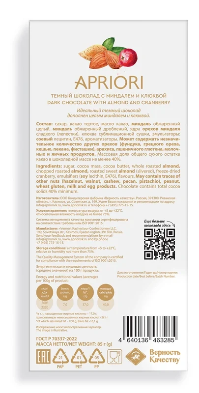 Шоколад Априори Deluxe темный с миндалем и клюквой, 85г