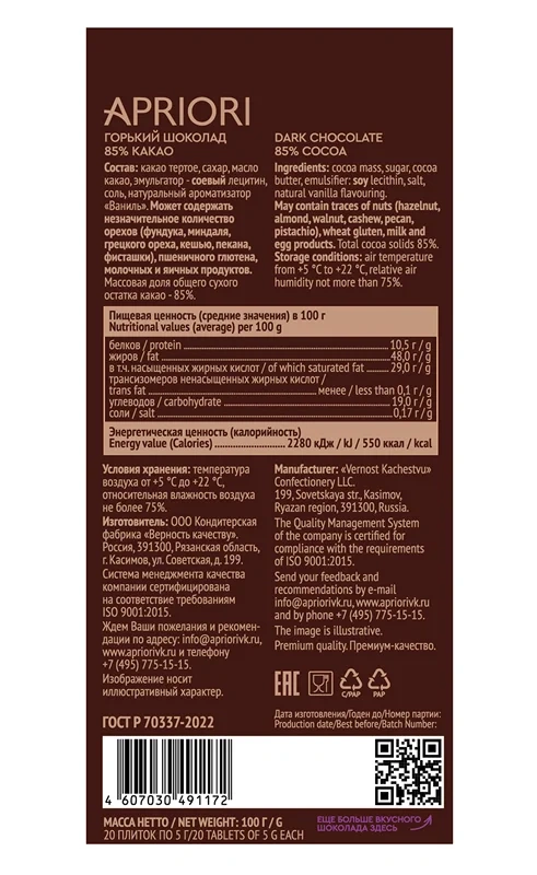 Горький шоколад с высоким содержанием какао. Благородный, терпкий и глубокий вкус для ценителей. Отличается высоким качеством ингредиентов, что позволяет ему раскрывать все тонкости своего вкуса с первого укуса. Благодаря высокому содержанию какао, этот шоколад не только удовлетворяет сладкие желания, но и приносит пользу благодаря антиоксидантам, содержащимся в какао-бобах. Упаковка выполнена с изысканным дизайном, что делает его отличным выбором для подарка на любой праздник. Такой шоколад станет прекрасным дополнением к чайной церемонии или романтическому ужину, добавляя нотку изысканности и утонченности. Шоколад Априори - это целая философия, основанная на любви к качеству и традициям кондитерского искусства. Он прекрасно сочетается с различными напитками, будь то кофе, чай или даже вино, создавая уникальные вкусовые сочетания. Каждая плитка горького шоколада - это возможность насладиться моментом и погрузиться в мир истинного шоколадного наслаждения.